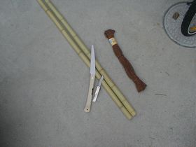 竹馬を作りました!伍長(小学2年女)が「竹馬の練習がしたいから作ってよ」 と言われて山に竹を取りに・・・・なんてしてません。とりあえずはホームセンタ-にと行ってみました。最初は丸棒と角材で適当に作ろうと思ったのですが丸棒一本900円とは高い!角材だと痛いし・・・と何か丸棒に変わるものがないかと探してると竹がありました。2メートルの青竹が350円だったので2本持って細い荒縄とボルトねじと折りたたみ鋸に小刀を買ってきました。これで総額2000円もしたが問題はどうやって作るか?これこれをそうそうしてあーすればと・・・実物合わせでやってみました。鋸で伍長のサイズに切ってから、あまった残りの竹を鋸とナイフでけがいてボルトとナットで止めて支えの支柱もあまった竹を割って裂いてけがいて荒縄で縛り付けてみました。なんともこれ中々良い出来じゃねーかよ♪なんといっても本物の竹です!ボルトナットは今時のものということで良いだろうよし伍長 春休みの間に乗れるように頑張れ!完璧なつくりに関心しました竹馬ぐらい作れるさ!ランキングネット亀吉生LIVE!ネットリアル放送中見るためには、javaが必要です。見れた方・見れなかった方恐れ入りますが、この日記・掲示板に連絡ください。携帯からのアクセスはhttp://redshirt.dip.jp/i です。(接続時のキャプチャー画像になります)