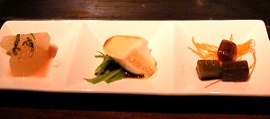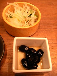 お通しの黒豆(お正月っぽい)と丼モノに付いてる大根サラダ