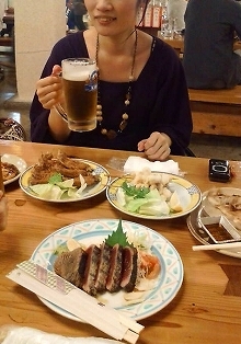 今回の定例会は私が幹事でした~ 日を決めたことに安心して、危なく店を決めることを忘れそうに。。 今回のお店は、私の会社の近所に出来た 「漁師料理 明神丸」 いつものごとくカンパ~イ まぁ、カツオの塩タタキは美味しい! ポン酢で食べるカツオのタタキより、だんっぜん塩タタキだなぁ~。 戻り鰹の季節でもあるから、ほんと美味しい。 みんな~高知に食べに来て~~!(*´∇`*) 最後に2度目の塩タタキの握りを食べました! ここでは5分目くらいのお腹で押さえて、ひろめ市場で飲みなおし! そしてそのままケーキ&コーヒーになだれ込む と、通常ならここで普通にお開きなんだけど、何とえりこさんの彼も町に来てるので今から寄ると言い出した! 今までにないハプニング?! 2年前のよさこい以来、姿を見ていないので、はっきり言って記憶では よさこいの髪型と衣装。。。 帰り道に立ち寄ってご挨拶して帰ってきました~c(>ω<)ゞ イヤァ~ 短髪になってて、何か思わず 「初めまして!」って言いそうになった。。 幸せそうな人を見ると、何だか顔がにやける。。