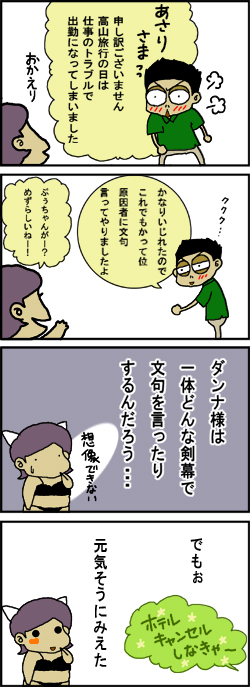 日々の疲れとストレスの発散を目的とした「再び飛騨牛と温泉!!」をスローガンにダンナ様は以前から岐阜高山方面への一泊旅行計画を少しずつ立て楽しみにしていたのでございますたまる鬱憤を口に出すほうが温泉に浸かるよりストレス発散の効能があったのではとwダンナ様 いつもご苦労さまです「いじれる」とは「ムカつく」みたいな意味だそうで、同じ県内出身でもあさりは判りませんでした何度も聞き返すとウザそうにする顔がまたv うふ(←病)
