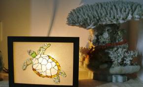 宮古島から移住して箱形ビーチグラス絵 2初めて作った箱形ビーチグラス絵(不要家具の引き出しを再利用)をご紹介したばかりですが、第2作目ができました。今回も以前からいくつも作った題材の「ウミガメ」です。「ウミガメ」は全て手放してしまって手元にないので改めて作っておきたかったんです。真正面から見ると、こんな感じです。大きさは18cm×25cm程度と小さいですが、斜め上から見てみると、安定感だけでなく存在感もあるように思えます。箱形第1作の「ヒラメ」と同様、電球を箱内部にセットしました。今は玄関先の下駄箱上に置いて、楽しんでいます。これまで下駄箱上に置いていた「ヒラメ」は2階に移動し、新しく買ってきた棚に、ランプシェードや花などと一緒に置いてみました。作品が徐々に増えて部屋が乱雑になってきてましたので、これで少しは部屋の中が整理できて、かつ楽しめるようになりました。それでも、床にいくつもの作品を置いた状態を完全解消できてません。そこで近々、もう一つ作品設置用の棚を置きたいと思っています。でも、置くところがある????