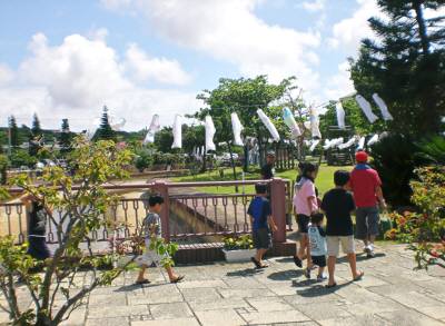 宮古島に移住してGWのドイツ村今日は宮古島も晴れました。昨日は昼前からの晴れだったんですが、その前はずーっと雨交じりの天気だったので、気持ちいいです。10時頃、車で宮古島市上野へ行ってきました。目的地は「うえのドイツ村」です。ゴールデンウイークの期間、敷地内にこいのぼりをたくさん泳がせて、子供たち用の遊具や出店などが出ているはずなんです。ただし、時間的に早いので、それほどの人出はまだないかもしれませんが。365日ゴールデンウイーク中の私も、人並みに休日の雰囲気を味わいたくて出かけたというのが、本音です。着いたのは10時半過ぎ。既に駐車場は3分の2以上埋まっていて、次々と子供連れの人が歩いていきます。芝生の広場を囲むように出店・遊具・舞台が並んでいて、子供連れの人たちがたくさんいました。お母さんに抱っこされた小さい子が滑り台を楽しんでいます。こいのぼりはちょっと休憩中でしたが。もう少し大きい子は、プールの中で大はしゃぎです。更に大きい子は、トランポリンに夢中です。そして、小学校高学年~中学生たちは、二人でぶら下がっているんじゃあないですよ。後ろ(白い帽子)の女性が、子供の体を持って、トランポリンの要領で上下に飛びながらはずみをつけて、思いっきり手を放すんです。その瞬間に子供は上空を目指して飛んでいく、というわけです。元気な子は空中で1回転したり。そんな遊具の向こうには、これまた子供たちの大好物、出店が並んでいます。ピザ・たこ焼き・フランクフルトなど々があるんですが、風船やさんも。アニメの主人公・剣・動物などいろんな種類があって、結構売れていました。広い芝生の会場も、少しづつ人数が増えてきました。そんな会場を見降ろすように、ドイツのお城をそっくり再現した塔が立っています。お城の中でもイベントが行われていたんですが、上の写真の右側に続いている石畳を進むと、海岸沿いに道が伸びています。お城のちょうど真後ろから見上げると、こんな感じです。ほとんど人は歩いていませんが、青い海の色と潮風を楽しみながら見る城は、なかなかいい風景です。 正午過ぎにドイツ村を後にして、ビーチグラス製作のため喫茶・松の樹へ向かいました。