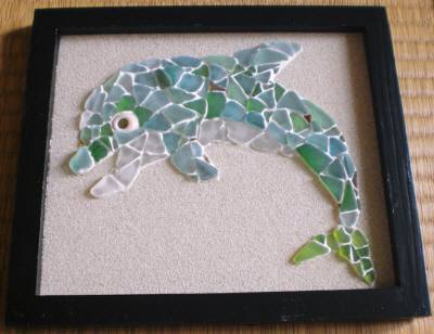 宮古島に移住して頭が大きい(?)イルカ沖縄本島旅行から帰ってきて、あっという間に1週間が経ちました。旅行の主目的であった「ピカソと20世紀巨匠展」は一部をブログ紹介し、もう一つの楽しみだったホエールウオッチングは船が欠航で行けなかった事もご紹介したとおりです。そのあと喫茶店で休憩(コーヒーを飲んだり本を読んだり)している時、なぜか、宮古島に帰ったら“イルカ”と“ザトウクジラ”をビーチグラス絵で作ってみよう、と思いました。クジラは分かるんですが、なぜイルカかと聞かれると自分でも???です。そんな事もあって、実は先日からイルカを作っていたんです。板硝子にビーチグラスを隙間なく接着していって、ビーチグラス間にセメントを塗りこみます。空白部分に微粒子状の砂を均一に固定して、絵自体は完成しました。市販の額を使用していますが、今回のはオレンジ色でした。そこで、事前に額の木部を黒ペンキで塗装しておきます。(ここまでの手順は従来通りです)額と絵はまだ接着していませんが、どんな風に見えるか確認するために額を絵の上に置いてみました。画面の大きさの割に、イルカが少し大きすぎるような気がします。でも、ここまで来るともう修正は不可能なので、絵を額に固定します。次に細長い木を切断し、くぼみ部分を作るため“ノミ”で彫りこんで、黒ペンキを塗れば、額立てが完成します。今回、彫りこみの幅を額の厚さ+5mmにしたんです(簡単に差し込んだり取り外せるよう)が、隙間が空きすぎて額(絵)が立ちません。固定できないのでは役に立たないので、3mmほどの木片を木工ボンドで接着して隙間を狭めるように補正すると、無事に額=絵が立ちました。安定感も充分です。ほんの2~3mmの差で、結果が大きく違うのにビックリしました。ここまで確認してから、額立ても黒ペンキで塗っておきます。額に固定されたビーチグラス絵を補正・ペンキ塗りした額立てのくぼみに差し込んで、完成しました。まだ外は明るいのでカーテンを閉めて窓側に置いて、後ろから豆電球で照らしてみると、こんな感じに見えました。今回のイルカは少し頭部が大きすぎるように思えます。下絵と比較してみると、やはりちょっとですが下絵よりも大きくなっていました。頭部のビーチグラスは意識的に小さめの物を選んだんですが、もう少し大きめの方が良かったかもしれません。次回はクジラを作ろうと思っていますが、イルカも違った形(体を伸ばしたり、尾びれをあげている姿・・・・)で作ってみたいと思っています。