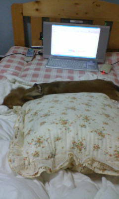 毎夜のことなのですがうちのれもんは寝る前に大暴れします。一通り暴れ終わるまでは寝ません今日も暴れております。しかも、かーちゃんのベットの上です。枕がわりのクッションを相手に格闘中それは良しとしよう でもね、れもんちゃん 勢いあまって後ろ足であたしを蹴るんじゃねーよしかも、何回も痛いんだよ そんな格闘も終盤を迎え・・・・お休みに入ったれもん ・・・しかも・・ベットを横切るように就寝中 ・・・・・・・どこまでも迷惑な娘だな・・・・・・・