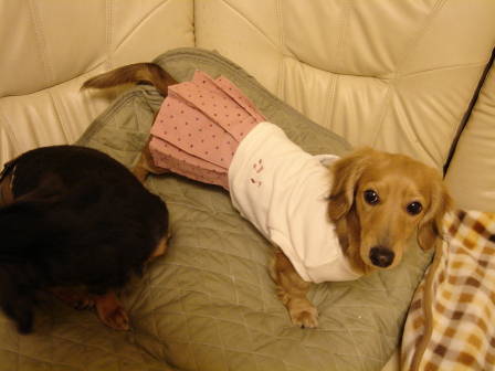 ▽・ェ・▽ノ""コンバンワン♪ この間、友人とドッグカフェに行った時の話。またもやれもん様のお洋服を買ってしまった・・・・・・自分の為に全然何も買っていないのでここいらで自分の為にも服を買わなくては!!!! 来月は必ず自分の為に服を買うぞーーーーーーーー で、早速買って来た服を着てもらう事に。 『おかーちゃまがどうしても買いたいと言うので買ってもらちゃった』 ううう・・・・・・・言い返せなくて悔しい・・・・このお洋服iDog様の服でしかもネットでは購入できないと定員のおねーさんに言われたら買うしかねーじゃん。しゃーないやん!! 『おかーちゃまのお給料をふんだくっているおねーちゃまでちゅ』 (*`д´)b グッジョブ チョコたん! ナイスだわ! 『ところで僕にはお洋服は無いのでちゅか?』 はい! ございません。 何故ならば・・・・・ 穴! 広がってるし!!しかも・・蹄入ってるし!! なんやねん!コレ!!!! なんで蹄入ってるねん!おかしいやんけ!なのでチョコたんにはお洋服は無しです。(もう既に一着破壊してるしね) 『ケチでちゅね~ しかも蹄とソファーのコラボが解んないのかな~』 解るか!! しかもなんやねん! なんでひじ掛けに手おいてるねん!お前は社長か!!! ヾ(*`Д´*)ノ"彡☆