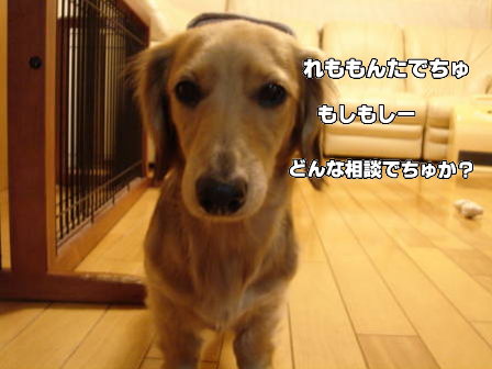 ▽・ェ・▽ノ""コンバンワン♪お散歩から帰って来てスグにスエットとTシャツに着替えてくつろいでいたら玄関のチャイムが!! ピンポーン♪インターホンで応対すると玄関前にはお義理母様が!!! あせりまくってたれもぷりんでございます。いや~ビビッたね・・・・・・ 前回のれももんたさんへの悩み相談が思った以上の反響がありその上、れももんたさんに相談にのって欲しいと沢山の方?からの相談のメールが届いています。今日はその方達の相談の回答をれももんたさんにお願いしました。では、れももんたさんお願いします。『はいでちゅ、何でもお答えしまちゅよ。』 では、まずピピリンさんからのお悩み相談です。え~っと、貧乳についてのお悩みですねれももんたさんお願いします。 『揉め!!』 ・・・・・・・・・・・・ ( ̄Д ̄;; もう一つの質問は貧乏についてですね。 『もっと働け!!』 ・・・・・・・( ̄ー ̄; ヒヤリ てな、回答でございます。 気を取り直して、次の相談です。次はおっとっとママさんからですえーっと、面白いブログで毎晩笑って腹痛に悩まされているようです。 れももんたさんお願いします。 『思う存分笑うがいい!』 ・・・・・・・・・・・・・・・( ̄□ ̄;) またまた気を取り直してみむともさん家の大地くん&ななちゃんからの相談です。なになに、ご飯を少ししかくれない飼い主が・・・って事みたいですね。 では、今度こそちゃんとお願いしますね。 『暴れろ!!』 ・・・・・・・・・・・・・・(゚∇゚ ;)エッ!? ・・・・最後の最後までちゃんとした回答を出せなかったのですがご満足いただけましたでしょうか・・・・・・満足してねーよね。