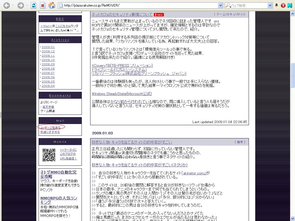 ニュースサイトもまだ更新が止まっているのでネタ回収に詰まった管理人です orzRO内で罠BOT関係のニュースが上がってますが、確定情報とするのは早計なのでネットカフェのセキュリティ管理について少し質問して来たので、紹介。管理人が良く利用する系列店の掲示板にてアカウントハック対策等について質問した結果、「リカバリソフトを導入している為、再起動すれば大丈夫」との回答。↑で言っているリカバリソフトとは「環境復元ツール」の事で有る。と言う訳でネットカフェ支援・プロデュース会社のサイトを巡って見た結果、3件発掘出来たので紹介。(画像による使用解説付き)XCoveryTB(TB-PRESS ソリューション)ドライブシールド(プロパーシステム)リカバリー・フラッシュ(株式会社グリーンフラッシュ ジャパン)一番最後のは体験版も有ったが、法人向けという事で一般では手に入らない模様。一般向けで何か無いかと探して見た結果…マイクロソフト公式で無料のを発掘。Windows SteadyState(Microsoft公式)公開自体はかなり前から行われている様なので、既に導入していると言う人も居そうだが導入していないと言う人は、セキュリティ対策の選択肢として一考する価値は有るだろう。