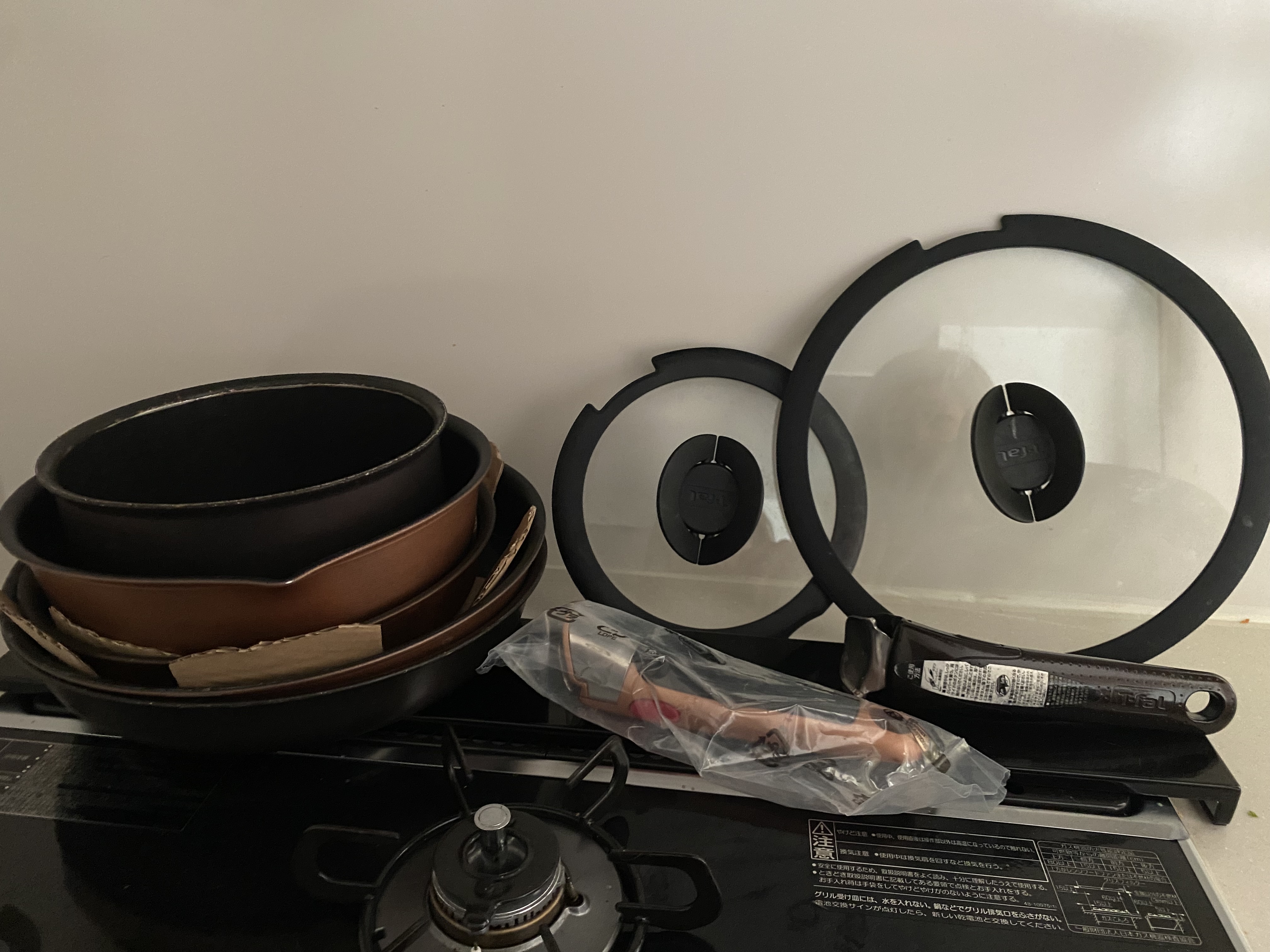 これ2セット分です。数年前にゲットしたもの(中鍋とフライパン大。もう一つフライパン中があったのですが使い倒した為サヨナラしています)と、昨年ゲットしたもの(フライパン中、フライパン大、深いフライパン)。これと普通のステンレスの鍋で全ての料理回しています。セット内容選べればリンク貼ったのとか使い勝手良さそう。ま、私のはポイントで頂いたものなんで。 もう取っ手取れないフライパンには戻れない?て、宣伝かい。