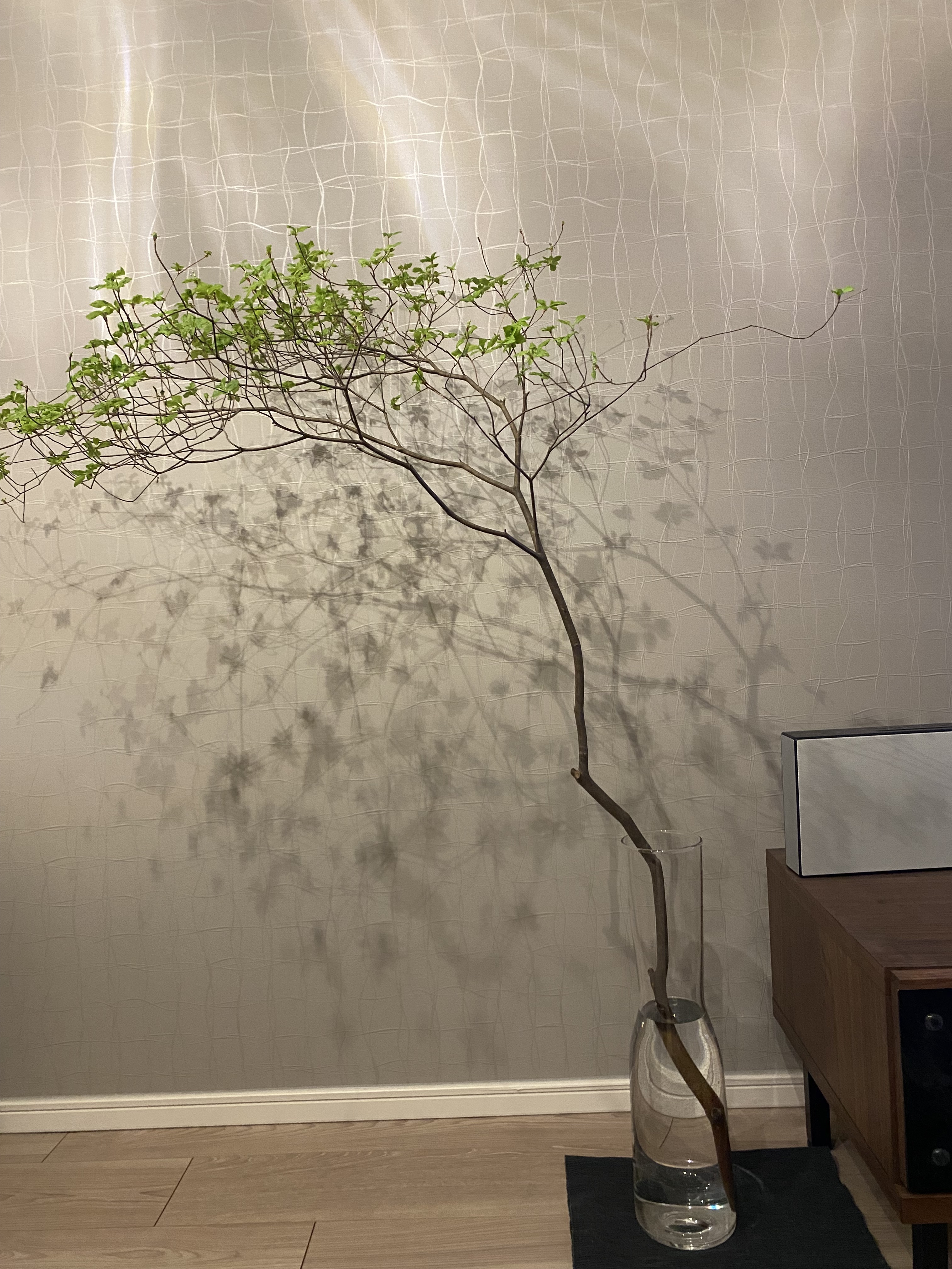 ドウダンツツジ店員さんにこれ花咲くんですかと聞いたら、基本花が咲かない咲くって言う区別はないです、と塩回答。花屋さんて冷たくないですか? 個人的な印象ですけど。以前住んでいた近所の花屋さんも初めは入りづらかったんですが、何度も通っているうちにちょっとした会話からよく話してくださるようになり良い花を選んでくれるようになったと思います。 今のお花屋さんとまだまだ遠い道のりかしら。枝は季節になると良く出る桜、桃以外は初心者です。以前のワンルームで一度コブシの枝(本当は木蓮が欲しかった)を買いましたが、飾った玄関通るたびに洋服に引っ掛け花瓶が転倒すると言う情けない思いをしました。花咲きますように。まぁ咲かなくても枝だけでも綺麗なのでそれはそれで。