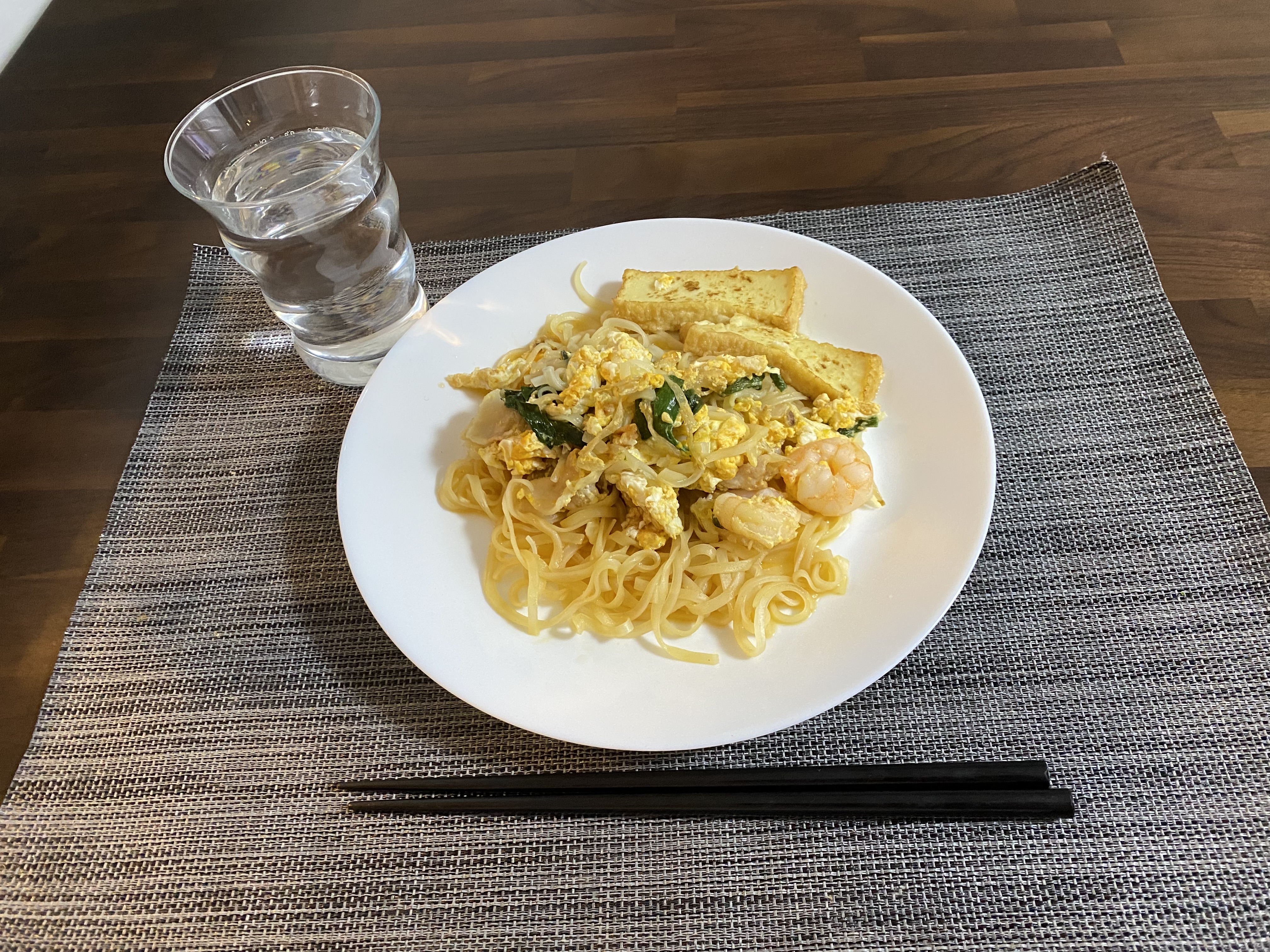 朝食パッタイ。乾燥麺と液体スープがついているやつ。具材の卵、厚揚、にら、もやし、豚肉、海老は自分で。驚くのは朝起きたらこの具材全部載ってるフライパンが冷蔵庫に入っていて、乾燥麺が半分に分けられていた事。時々あるんです。誰かが朝食下ごしらえしてくれていること。はい。昨晩酔っ払った私ですが。記憶ないです。今朝も、さあ、今朝は蕎麦かな、と何気なく冷蔵庫開けたらこのフライパン。冷凍にら、もやし溶けてるし食べない選択肢はない。ま、火にかけるだけで出来上がるし美味しく無いわけは無いので…。ご馳走様でした。