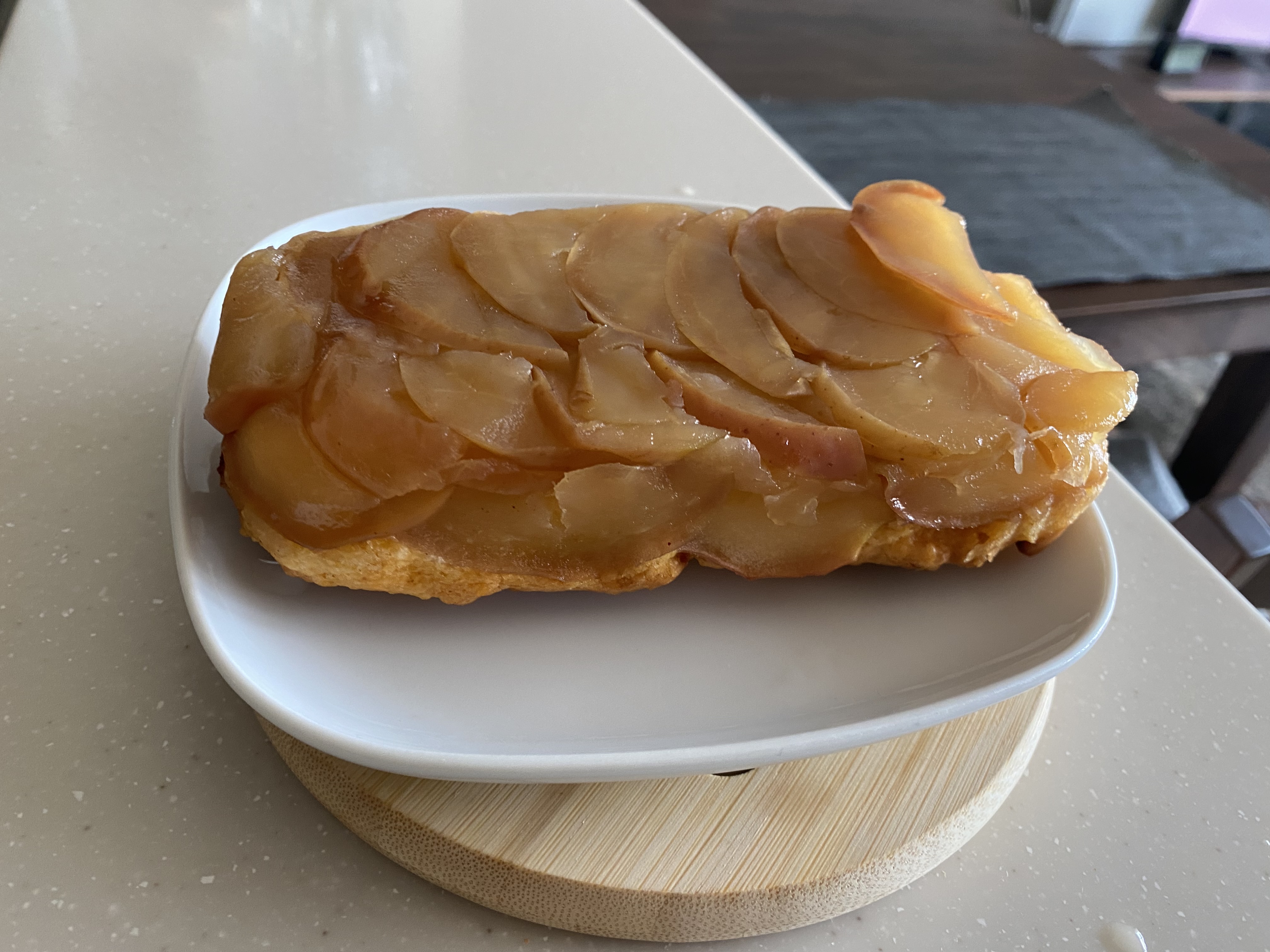 そこでタルトタタンの話があったのと、昨日スーパーでりんごが安かったので。ネットで見つけた複数レシピを良い所取り、というか自分の都合にあわせて(ホットケーキミックスは無い、丸型ケーキ型は無い、アーモンドパウダーも無い)つぎはぎで作りました。見た目は余りよろしく無いなあ。でも甘さ控えめ(パルスィートで代用)、バター控えめ(勿体ないから既存レシピより減らして)でもりんごの甘さが感じられる大満足な仕上がり。