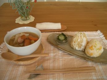 ここ2,3日でずいぶん寒くなりました・・・・今日は県内でも雪が舞うところがあるそうで・・・・日本中冬に向かっていますね。こんな寒い日はやっぱりお鍋が食べたいですね~~~私はお鍋が大好きなのでこれから楽しみな季節です♪と言うわけで、今日のお昼はポトフ。慎ちゃんの大好物です。おにぎりは通称「たぬきおにぎり」しゃけやたらこなどが無いときは、我が家で良く作るおにぎり♪これがとってもおいしいのです・・・・・・今日はおぼろ昆布を巻いてみました♪