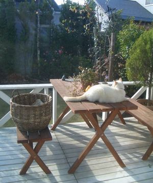 朝、我が家にお客様。赤い首輪が良く似合うブルーアイズのきみはどこの子?朝日をあびて、気持ち良さそう・・・・