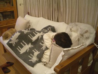 今日は慎ちゃんのお誕生日♪私「何が食べたい?」と聞いたら「チキンカレー♪」私「・・・へ?・・・・カレー?・・・」夫「うんっ♪」私「もっと他に食べたいもの無いの? 前もカレーが良いって言ってたし・・ レストランとかおすし屋さんとか・・・」夫「でも! カレー」私「・・・・・・・・・・・」夫「カレーはカレーでもチキンカレーね♪それでジャガイモとにんじんは 大きくて、たまねぎいっぱい入れてね。そこはこだわってるんだ♪」・・・・・そんなこだわりで良いのか?・・・・・結局、また家でカレーを作ることに・・・・・慎ちゃんはおうちのご飯が大好きだから、仕方が無い・・・・いつもよりキャンドルをたくさん焚いて、サラダも豪華にして本日はカレー・・・・・ハッピーバースデイの歌も歌ってあげました。メイとモモもうれしそうにボイルしたささみを食べて・・・・・みんなでお祝い♪画像は先日の夜、3人でうたた寝しているところをパチリ。モモ・・・・どこにいるんだろう???またソファーに同化している・・・・こんな毎日・・・眺めているだけで幸せさっ♪