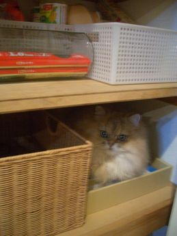 私「へ? メイ~~~~~ッ!ここで何してるのお~~??」メイ「・・あ・・・・見つけちゃった?」なんとここは食品庫の中・・・・ちょうど古雑誌などをまとめておく箱の上にメイちゃんが昼寝中・・・・朝からキッチンのお掃除で食品庫を開けておいたらいつの間にやら入り込んだらしい・・・・・ネコってこんな狭くて暗いところ好きなのよねえ・・・・・お掃除の邪魔なのでとっとと追い出したら・・・・・クッションの上でふて寝・・・・・