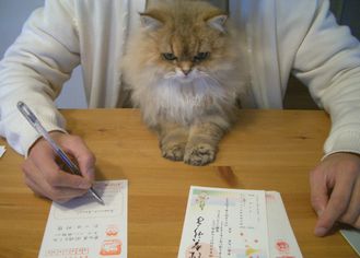 クリスマスが終わると、年末の準備に追われますね。慎ちゃんは毎晩、年賀状を書いています。書きはじめると・・・・・・・・・メイが乱入・・・・前足をテーブルに置いて、ボールペンを観察中・・・・夫「ねえ・・・書きづらいんだけど・・・」メイ「・・・・・・・」(無視)ちなみに書き終わるまで、彼女は動きません♪
