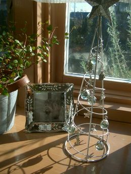 何年か前に雑貨屋さんで見つけた小さなツリー。綺麗なビー玉と銀色のオーナメントがゆらゆら揺れてかわいい♪今年も出番がやってきました~ルン♪さて私はこれからまたお仕事です。この3日間で3つ描きました・・・4日目の今日は4つ目・・・なんとか仕上げるじょ~~~~
