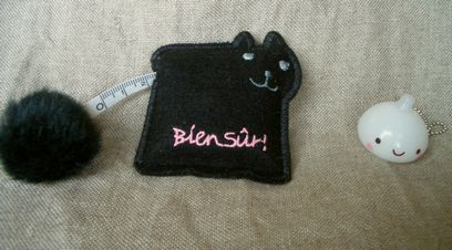 これはメイとモモの大好きなおもちゃです♪モモが好きなのは、黒猫のメジャー・・・・しっぽ部分がメジャーになっていてびよ~んと伸びます。もちろん私のお裁縫道具・・・・このしっぽが大好きなモモ・・・・・メジャーを伸ばすときに「カチカチカチ」と音がするのでその音に反応して寄ってきて・・・・・怪獣のように毎晩追い掛け回して遊んでいます。メイは温泉饅頭のキーホルダー・・・・ゴムのようなぷよぷよのマスコットです。生徒のSさんからもらったのをきっかけに「超お気に入り」・・・・・これを見せただけで目の色が変わります。追い掛け回して噛んで遊ぶので、最後はよだれまみれのぼろぼろ状態・・・遊ぶとき金具ははずします・・・もろとも食べてしまいそうなので・・・・今夜も2人は、このおもちゃにしびれています♪