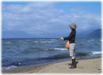今日は描いた作品の図案とインストラクションを作っております。7日にお渡ししなければならないので・・・がんばります。1月締め切りの作品が続きますが、早めに描いて(願望)年末のお掃除をしたい!メールのお返事も明日にはできますのでもうしばらくお待ちください・・・申し訳ありません・・・・画像も撮れなかったので、なんだか昔撮った画像を・・・・猪苗代湖にドライブに行ったときの私・・・・釣りをしているわけではありません。長い枝を拾ってかっこよく釣り師のポーズをとっているところ♪