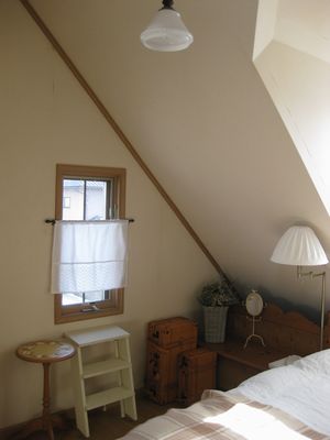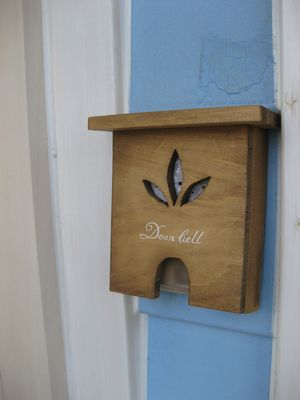 我が家のドアチャイムです。ピンポ~ンと鳴るだけの普通のドアチャイムなので見た目がいまいち。家を建てた当時に、カバーを作りこれは2代目・・・・オイルステインで色をつけました♪真ん中のくりぬいた部分からちゃんと声が聞こえるようになっています。パッと見ると、インターフォンと気がつかない事もあるようですが・・・・・でも生徒さん達も気に入ってくれているようなので良かった♪奥に写っているのは2月に増築した部分♪ 私の仕事部屋です。ちなみに、深緑のイスも白い雨戸も私の手作りです。小さなお部屋だけど主婦がお部屋をもらえるなんて・・・とっても幸せ者です♪