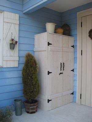 2月のリフォーム・・・・ 玄関脇に物置を作りました。枠は大工さんがバッチリ作ってくださったので、細かいところは自分で♪物置は庭の端にあるのですが、玄関脇にどうしても欲しかった・・・・雪国ですから雪が降れば雪かき・・・ 長靴や雪スコップが必要です。物置まで取りに行くまでに雪の中を歩くしかありません。それじゃあ意味が無いわ・・・・ ついでに傘やレインコートも仕舞いたい。アイアンの金具なども気に入ったものを探して・・・・・便利でかわいい物置ができました♪ほら♪ こんなものが入っています。ちなみに・・・真ん中にぶら下がっている傘・・・・・見たことあるかも?しっかり普段使いです! 雨ザーザーでも使っちゃう♪ オホホホホホホ~~~
