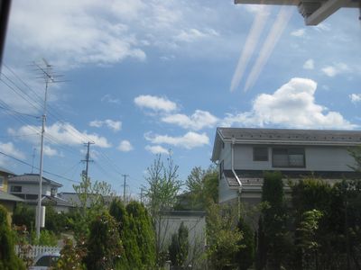 私の仕事机は南向きです。目の前の窓からこんなきれいな空が見えます♪今日は青い空・・・雲のバランスも良い♪風が強かったので雲がグングン動いていきます。仕事をしながら、ちょっと筆を置いて前を見るとこの景色。・・・・・贅沢だなあ・・・・・田舎に住んで良かった♪ 庭もグリーンが濃くなってきました。薔薇が咲く頃は5月中旬から6月・・・・ここから眺めるのが楽しみです♪おかげで仕事もサクサク進んでいます~~~ (←ほんときゃ?)