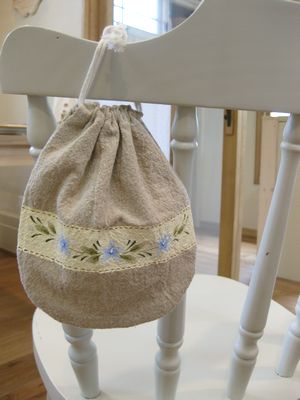 今日のレッスンで、またまた生徒さんの素敵な作品を見せてもらいました♪この巾着は、U講師の手作り♪ 体験会用に考えたデザインだそうです。画像では良く見えませんがサイドローディングは使っていないのですよ。初心者さん用にドライブラシとベタ塗りで描けるブルースターです♪とってもかわいい~~~~丸い形の巾着もベリーグット♪こちらは、生徒Kちゃんのもの♪なんとこのバック・・・・古くなった白いズボンをリメイクしたそうな・・・・・すごいアイディアだわ~~~~~白い野バラを描いてさわやか♪ 毎日、愛用しているそうです。描きこんだ立派な絵を額縁に入れて飾るより、小物の一部や布製品にさりげなく描いてもらえるように・・・・・私のトールデザインは、いつもそんな思いで作っているから・・・・こんな風に、私のデザインを利用してもらえるのがとってもうれしい♪