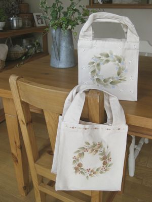 5月7日から始まるホビーショーでの体験会用作品です♪私の担当は8日。アンジュコーナーでお待ちしています♪たしか材料費込みで500円で体験できたはず・・・2種類のうちどちらか選んでくださいね。1時間ほどで描けますよ♪ぜひぜひ参加してくださいね~~~~~かわいい小花のランチバック♪木の実のバックもなかなかでございます~~♪