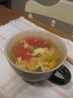 トマトが旬な夏には、我が家で定番のトマトスープ♪今日は、エビとズッキーニ、インゲンなどを入れて色どり綺麗~~昔、教えてもらったスープなのですが、どんどん自分流になっています。炒めた生姜の香りが食欲をそそります。慎ちゃんの大好物♪ これは、モロヘイヤのスープ♪モロヘイヤも夏の定番野菜ですね。健康にもとっても良いのでどんどん食べたい野菜です。今日は、ズッキーニも入れていろどり良く。モロヘイヤをミキサーにかけてスープにすると、きれいなグリーンスープに♪おまけ・・・・たらこスパゲティ♪大葉をのせて~~バターとコブ茶がポイントの人気メニューです♪これを開発(?)したのは、16年ほど前・・・・テレビの料理番組がヒントになり、あれからずっと・・・作っています♪