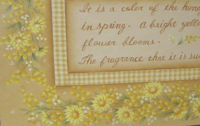お盆も終わり、夏休みも終盤に近づいてきましたね。お子さんのいるご家庭では、宿題に大わらわ・・・・・だったりして??みなさん、がんばってくださいね~~~~~私もこの夏いっぱいがんばりました♪ゆっくりのんびり・・・とはいきませんでしたが、お仕事も予定通り進んでおりなんとか無事に秋を迎えられそうです。9月から年内いっぱいは、気の抜けない毎日が続くので体調管理に気をつけてがんばるじょお~~~~~~画像は、カレンダーの作品です♪ハチミツ色で春の喜びを表しました。