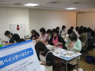 セミナー会場の様子です。みなさん真剣にお勉強中・・・・ お部屋が狭く作業しづらかったのですが20名のみなさん全員肩寄せ合ってがんばりました♪参加して下さったみなさま、本当にありがとうございました。そして、キャンセル待ちで受講できなかったみなさま今回は本当に残念でした。次回のセミナーではぜひぜひお会いしたいです♪参加者のみなさんのほとんどは、「出口バック」にお道具を入れて来ていて・・・この3名の出口菌感染者さんはそれぞれデザインの違う「出口バック」~~~とってもかわいく描いていたので写真を撮らせてもらいました♪ご協力ありがとうございました♪セミナーの後、ダッシュで半蔵門まで戻り、プロセスの撮影・・・・お昼は無理だなあ・・と思いながらスタジオへ行くと担当さんが「先生お昼食べてないんじゃないですか?」とパンを用意していてくださいました・・・・なんてやさしいの♪おなかも落ち着いて、無事に撮影を終えることができました♪しかし・・・郡山に着いたら、すごい雪・・・・道路はピカピカに凍結していて・・・・・家に着くまでに、1時間半もかかってしまいました・・・・トホホ今日も気温が低く、雪はあまり溶けていません。・・・・春はまだ遠いのかしら・・・・・