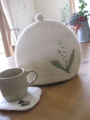 本校のお教室はお休み。春休みに入りました♪しばらく生徒さん達には会えませんが、この間に新作をコツコツ描きます。庭や部屋も春の準備♪ひざかけやウールの小物などは秋が来るまで、おやすみです。このティコーゼやコースターも、ちょっとお休み♪スズランのフェルトのティコーゼは冬の間大活躍。お気に入りなので、見ているだけでほっとします。ひつじのコースターもお気に入り♪ふわふわで温かい飲み物にぴったりですでも、夏の麦茶やアイスティには、合わないので・・・・・フェルトくんたち、秋までさようなら~~~♪