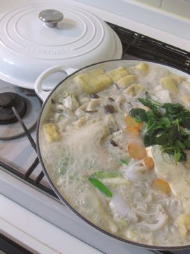 冬の間は、お鍋料理が活躍しますね。春めいてきましたが、まだ夜は冷えるので今日は「豆乳鍋」体が温まります♪我が家のお鍋・・・・これは琺瑯の鍋・・・お気に入りです。深さがないので、パエリアや炒め物など・・・フライパン代わりにもなります。何より美しい形♪私が、台所道具を選ぶとき「機能性」も大事ですが、「美しさ」にもこだわります。毎日使う道具だから、それを見るたびにニンマリして・・・作業も楽しくなります。考えてみれば「とりあえずこれで良いか」という買い方はしないかも・・・・今日もこのお気に入りの鍋をながめながら、楽しく食事の支度です♪
