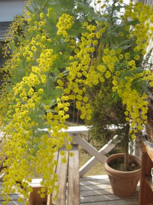 なんちゃってハウスの中のミモザが咲き始めました♪まだ小さな木なので、初めてのお花です。きれいな黄色♪ 春の色です。最近お天気が良くないので寒々しい日が続いていますがこんな明るい色を見ると元気が出ますね♪