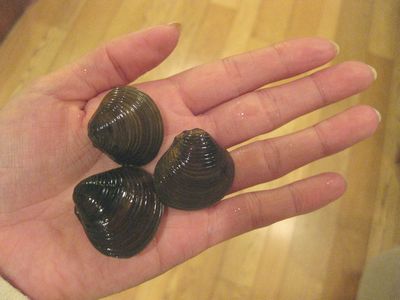 これは、巨大シジミ♪この時期、近所では、田の水路や川でシジミが取れます。もちろん淡水のシジミ。採ったばかりと言うシジミをいただきました。普通の大きさの時はきれいな緑色をしていますが、ここまで大きくなると黒っぽいですね・・・・・手の大きさと比べていただけるとわかると思いますが、アサリより大きいかも。小分けにして冷凍保存♪冷凍するとおいしいのです♪今日のブログが、シジミの画像だけではさみしいので・・・・・こちらの素敵なものは、生徒さんが編んでくれたヘアゴム♪紫のお花がかわいいですね~~~~とってもうれしい~~大切に使わせていただきます♪