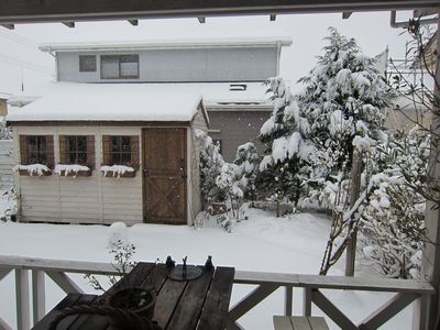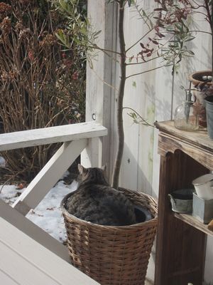 朝起きてカーテンを開けたら・・・・オリーブのプランターの上にしま模様のつちのこ???「しましまの饅頭みたいだな・・・」と慎ちゃん。なにしろ土の上が暖かいサバくんです・・・・お部屋ではマルちゃんはお友達と一緒に、朝寝中。数日暖かかったのに今日から元通り・・・・雪が降りました。まだまだ2月東北の冬は長いのです・・・・明日から横浜イベントですね~~~私は明後日にお邪魔します♪