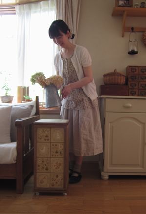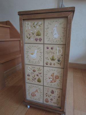 こちらは、絵の具やメディウムを入れるペイントラック♪アンジュさんが、今年の春に新発売したウッドです。今回名古屋のイベントになんとか描いてもらいたい~~~とアンジュさんの押しに負け・・・・・がんばって仕上げました♪正面はタイル状になっている扉♪上部には、春と夏をイメージして・・・ウサギやアヒルも描きました。下部には、秋と冬をイメージして・・・リスとキツネも描きました。天板は、オリーブでこんな感じ♪側面は刺繍風ボーダー♪扉を開けるとアルファベットで可愛く仕上げてあります~~この引き出しはミニトレイになっていて、取り外しができます。棚板も外せるので、絵の具以外にもいろいろ家具として使えそうです♪ベットサイドに置いたり、お裁縫道具を入れるのも良さそう・・・私は動かしやすいように底にキャスターを付けました。どこにでもコロコロ運べて便利ですよ~~名古屋の会場にはこの作品が飾られるのでぜひ間近でご覧ください♪ただし・・・大きなキットなので当日はお持ち帰りできません。すべて後日配送になるそうです。お値段はたしか15000円くらいだったかと思います。ペイントボックスとデザインパック、そして送料込みだと聞いていますよ。かなりお買い得なお値段だと思いますので、ぜひぜひこの機会に~~~~~がんばって描いたので、気に入ってもらえるとうれしいです~~~