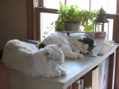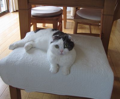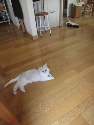 ももちゃんとまるちゃんは、最近かなり仲良しになってきました♪今日はアトリエで並んでお昼寝。ももは臆病で他の猫がくるとすぐ逃げちゃうのだけど、まるとは少しずつなじんできている感じ♪まる「あ、ママ何やってるの~?」・・・・・あら、まる起きた?まる「あ、お姉ちゃん。あたしの陣地はここまでだからね。はみ出ちゃダメだよ」・・・・・・・それじゃあ、ももちゃん落ちちゃうでしょうが・・・・・・・・意地悪だぞ、まる!まる「ママ、こう言うのはね~~先に言った方が勝ちなのお~~イッシッシシシ・・・」 ・・・・・・性格悪いぞ。まる・・・・・・
