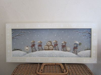 マンスリー第1教室、12月の作品です♪「奇跡の夜に」と言う名前がついた作品ですが、 これは・・・・・いわゆる「笠地蔵」・・・・クラスのみなさんからのリクエストで描きました♪「えええ? 笠地蔵描くのお?」と最初は戸惑いましたがなんとか描けちゃうものだわ~♪トールでは海外の童話をモチーフにする事が多いですが日本の童話もなかなか良いですね♪またリクエストもらったら描きます~~~~これから、親切なおじいさんのおうちに向かうお地蔵さん達♪米はお正月に必須アイテムですよね~最後の子は大根を運んでます・・・・・「なんで?」と良く聞かれますが、・・・・・・なんとなく大根だったから・・・・日本版のサンタクロースのイメージで描いています。なにより・・・クラスの皆さんが気に入ってくれたので本当に良かった♪12月まで楽しみに待っていてくださいね~~~このセミナーのお申し込みお問い合わせはアンジュさんまでお願いします~~