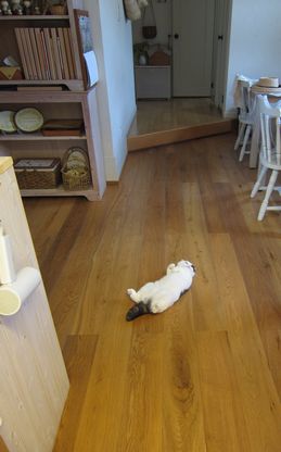 わーいトマトもらったあ~♪農家さんが収穫したばかりです。先がとがっているのでファーストトマトかな♪真っ赤でぴかぴかです~さっそく煮込んでピューレにしましたよ。今年もピューレたくさん作っておこうっと♪ さて、今日のマルちゃんは・・・・・こんな感じ・・・・猫とは思えない寝姿です。