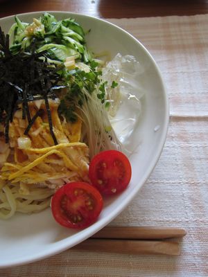 と、言ったら「スイカ」か「冷やし中華」か!?(←なんで?)今年の夏も暑いので、みなさんのところでも活躍中でしょうか・・・我が家の冷やし中華のなかでも1番人気は中華だれ♪しょうゆ 大さじ3砂糖 大さじ1酢 大さじ3ごま油 大さじ1おろしショウガ 小さじ1ネギのみじん切り 大さじ2~3ラー油小さじ1この量で1,5人~2人分くらいです。良く混ぜておきます。麺が茹で上がったら水でしめて、その麺にごま油小さじ2(オリーブオイルでもOK)と醤油少々をいれて混ぜてくださいね。好みの具を乗せて、作って置いた「たれ」をかけて完成♪ネギとショウガが良い香りでおいしいですよ♪冷やし中華や焼きそばなどは麺だけ買って我が家で味付け♪たれがついていると・・・・困る・・・・いろんな味付けを考えるのが楽しいからね~~~~安全だし、経済的だし♪ そして、おいしければ幸せ幸せ♪ ルン♪