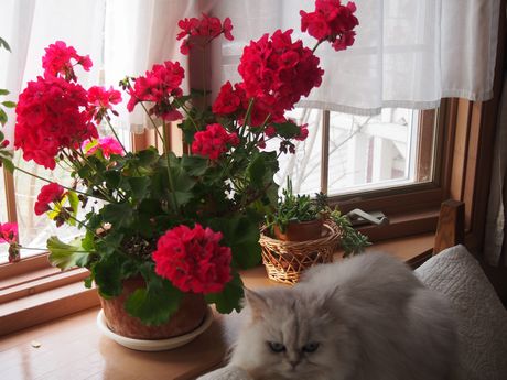 明日から大阪と横浜に出張です。大阪マンスリーに参加してくださる42名の皆様♪そして横浜京急イベントセミナーに参加してくださる30名の皆様♪どうぞよろしくお願いいたします~~~~なんだか気温が暖かいらしいですね・・・・・福島は寒いですが・・・・雨は日曜日に降るらしく・・・・・・横浜は・・・・・嵐になりそうもありませんね・・・・・去年は大雨、2年前と3年前は吹雪だったのですが、今年は私のパワーが足りないようで??でも何が起こるかわかりませんので、傘のご用意を♪みなさん元気にいらしてくださいね~~~~掲示板やメールのお返事は2/4以降になります。よろしくお願いいたします。画像は、咲きすぎたゼラニウムとモモちゃん。冬だと言うのに我が家のゼラニウムは、次々咲いて大盛り上がりです・・・・・モモちゃんは、ちょっと不機嫌?またマルちゃんに負けたかしら・・・・・オホホ・・それでは元気に行ってきます~~~~♪