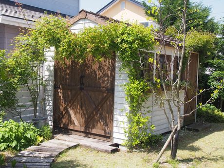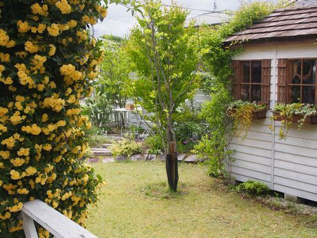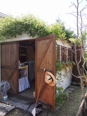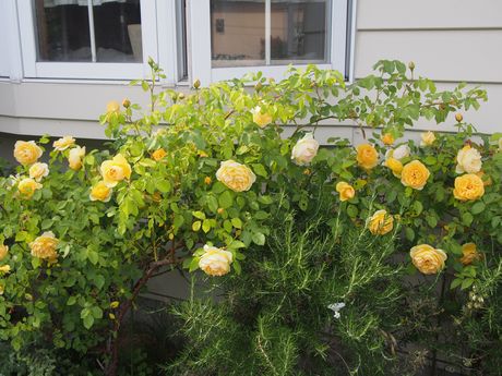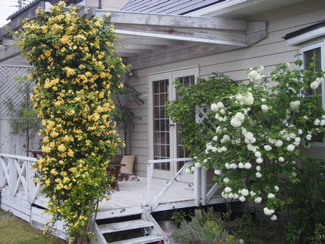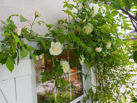 出張から帰ると・・・・なんと物置のバラが、ダランと外れているうう~~~!!風が強かったせいでワイヤーが外れたのだわ・・・・・・・・・と言う事で♪今日、直す事に♪屋根に上ってさっそく作業です。かなりバラが重くなっているので、ビスを何本か打ち直し・・・・慎ちゃんに下からバラを持ち上げてもらい、しっかり茎を縛りました。下で暇そうにしている慎ちゃんが、「めったに屋根に登らないから♪」と記念写真を撮ってくれました~~~♪完成だ! 無事にバラを固定することができました。 わ~~い!ついでに、こちらのバラもきちんと固定。今年も、台風の季節にそなえておかなくっちゃ♪今の我が家の主役は、モッコウバラ♪いよいよ満開です。なんだか今年は花つきが良いなあ・・・・株が疲れないように気を付けないと・・・・6月になれば他のバラたちも咲きはじめます。楽しみ~~♪