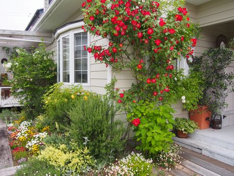 今は、真っ赤なカクテルが満開です♪モッコウバラの黄色が咲き終わる頃、遅れてカクテルが咲きます。その後、他のバラたちが順番に咲いていきます。足元のエリゲロンも満開です♪フェンス脇の黄色モッコウバラもピークを過ぎました。かわりに、隣の白色モッコウバラが咲き初めて・・・・壁のアイスバーグも咲きはじめました♪花が次々に咲くように、庭のレイアウトを考えてきました。花の咲く時期を把握するのは、庭作りで大切な事の1つです。本に書いてある開花時期と、自分の庭では違いがあります。こればかりは、育ててみないとわからないので試行錯誤・・・・・ガーデニング歴、20年だけどまだまだ勉強中です♪ でも、これがかなり楽しい!カクテルが咲き終わる頃には・・・・隣のサマースノーが咲きはじめるように配置してあります。そしてサマースノーが終わると・・・足元のアナベルが花の準備に入ります。この時期から6月上旬まで我が家の庭は、花ざかりに♪車で家の前を通る人から、庭を褒めてもらったり・・・・知らないかたから「オープンガーデンはしないのですか?」など聞かれる事も多いのですが、・・・・・・やりません・・・・・・だって、私だけの花園なんだもおお~~~ん♪ オホホホ~~~~