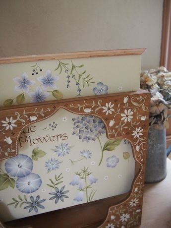 また、金曜クラスの皆様へ 大切なお知らせです。そろそろ次の材料が届いているかと思います。宿題のインストラクション部分に追加がありますので以下をご覧ください。インストラクション下準備(セミナーまでの宿題)1、ヤスリをかけたら、布(手ぬぐいのような布が最適)に ステインを含ませてフレームを拭きます。使用するステイン オイルステイン(オーク) *フレームは側面や内側までステインを塗ります。 引き出し部分の取っ手も忘れないように・・・・ 乾燥後、全体にシーラーを塗ります。2、内板はシーラーを塗った後、縁をマスキングします(スライドさせる部分に絵の具がつくと フタが閉まらなくなります。しっかりマスキングテープを貼ってください)ベース DA257+ライトモデリングペースト(1:1)でベースを作ります。 *引き手のところはマスキングしておいて下さい。 良く混ぜてなめらかになったら表面にペイントナイフで平たくのばします。その後 スポンジローラーを転がしてベースを塗ってください。 量が多いとローラーが滑ってまわりません。その場合はタオルなどでローラーに付いた 絵の具を拭きとって転がしてください。きめの細かいざらざらした表面ができたら 良く乾燥させてください。3、内板とフレームの図案を写します(水で消える転写紙で) 注意、引き出しはフレームの上部から入れるようになります。 内板の取っ手が上になる様に図案を写してください。以上です。みなさんの手元に言っているインストと違う部分(赤文字)がありますのでこちらを良くお読みになって宿題をやってくださいね♪違う部分は、画像のようなスライド部分のところです。溝に余裕がないので、モデリングペーストでベースを作ると厚みが出てスライドできなくなってしまいます。溝に沿う部分はマスキングテープで保護してモデリング剤が付かないようにしましょう。もし、もう宿題をやってしまって、スライドできない場合はヤスリやカッターなどで削ってください。他にも、不明な点がある場合はご連絡ください。どうぞよろしくお願いいたします。みなさん~宿題がんばってくださいね♪今日のリビングのお花は、これ♪ジュンベリーがあまりにも実が多くて、取りきれず・・・・バシバシ切って花の代わりに♪緑と赤のコントラストが綺麗です♪
