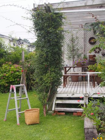 今日は、半日だけお庭に出ました♪涼しくなって植物もどんどん伸びます。特にモッコウバラは今が伸び頃・・・・柳のように垂れ下がります。この茎は新しいものなので、誘引しておかねばなりません。来年、形良く育つように上手にまとめておきます。この際、古い枝(茎が白っぽくなっている)は、カットしてしておくと良いのです。古い枝と新しい枝を交換しておけば、毎年花がいっぱいに咲いてくれるので~ちなみにこの新しい茎は、出てきたからと言って切ってしまっても無駄です。切ったところからまた同じような茎がシャシャ~~と伸びてきます・・・・モッコウバラは強健です。どんどんどんどん巨大化します・・・・・・なので♪面倒くさがらず、ちゃんと誘引してあげましょう~~こうやって手をかけるのが、ガーデニングの醍醐味なのだ。手入れ無しでも、お庭が綺麗に・・・・なんてこと絶対ありませんのよ~~ オホホホホ~~~お昼までに終わらせようと、脚立を担いで庭を走りまわる私をよそに・・・・・彼は・・・・・・・・・・・・白目むいて、爆睡中・・・・・・