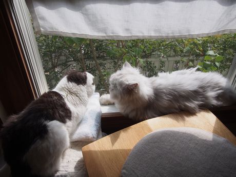 窓辺では、例の二人が仲良さそうに外を見ています。モモちゃんは、ひとりでいるのが大好きなのに、マルちゃんの事を少しずつ受け入れる様になってきているようで・・・・・・・・・・・ああ・・・ほほえましいわ♪・・・・・・・この調子でどんどん仲良くなって、そのうち寄り添ってお昼寝♪・・・・なんて事が・・・モモ「・・無いな・・・」・・・・・・・・・あ、そう・・・・・・・