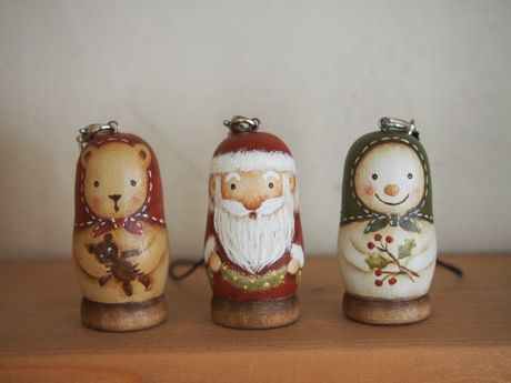 ミニマトリョーシカ 第2弾でございます!先日ちらりと頭部分だけお見せしましたが・・・・・サンタさんとスノーマンとクマくん。スノーマンとクマくんは「ほっかぶり」なのです。この方法だと耳がある動物も描ける予感♪後ろは、こんな感じ♪アンジュさんからの発売は、10月17日からの予定です~~~カッパたちと同じように白木が1つ付いたキットになります。たぶんお値段も同じだと思います。みなさま、先週発売になったばかりの、ミニミニヒツジはもう手に入れられましたか?・・・・・なんだか、すでに品切れの噂がありますが・・・・・こちらのマトリョーシカシリーズも楽しみにしていてくださいね♪