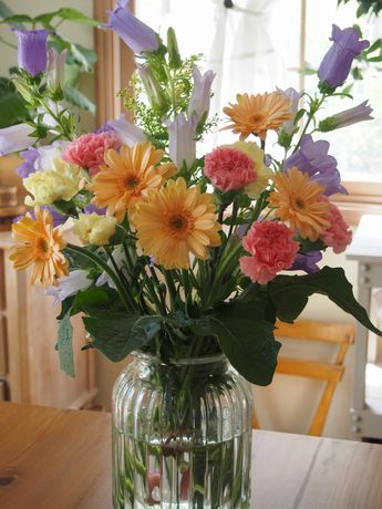 今日、慎ちゃんが買ってきたお花。「母の日だから~~」と慎ちゃん。・・・・・・いつから私、あなたのお母さんになったの・・・・・・仕事途中に見つけた道の駅で買ったそう♪「バケツにいろいろ入ってて、綺麗だったからさ~♪ 毎日がんばってるからプレゼント~」新聞紙で無造作に包まっている新鮮な花達♪慎ちゃんのやさしさがにじみ出ていました。私「でもさ、なんでこんなにたくさんの色の花買ったの?」慎ちゃん「種類も色もいっぱいあったほうが良いと思ってさっ♪」・・・・・・・う~ん、慎ちゃん、色のセンスは無いらしい・・・・・でも、まとめて飾っちゃうよ♪ 気持ちが嬉しいからねっ
