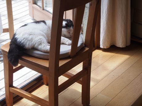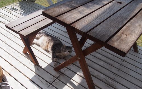 我が家の庭も緑がどんどん濃くなっています♪さて・・・・彼がどこかにいますよ・・・・・・・・・ここです♪木陰は涼しいので、スヤスヤ寝ています・・・・・・・・あ!・・・見つかっちゃった・・・・・・・・・そして数分後、水やりを終えてデッキを見ると・・・・・・・・・サバくん・・・・・やっぱり、太り過ぎだな・・・・・
